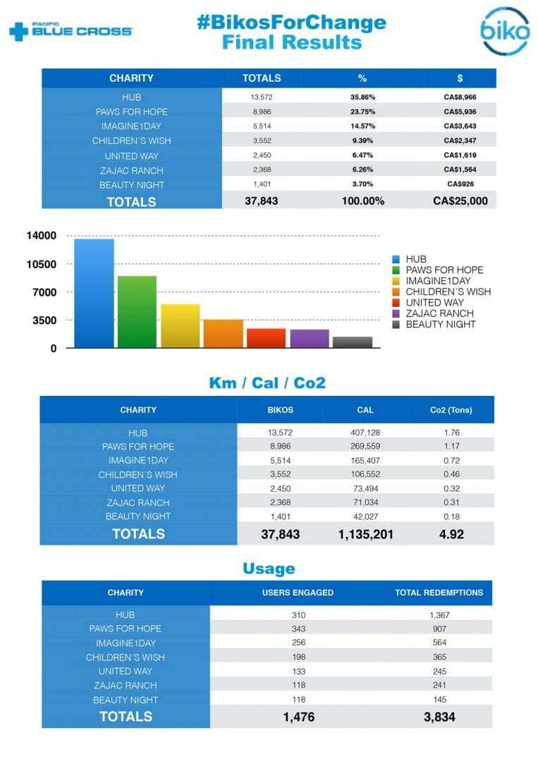 BIKOS FOR CHANGE was a month long charity competition, sponsored by Pacific Blue Cross. For one month, seven fantastic local charities urged Vancouverites to earns bikos and then donate their bikos to the charity of their choice. At the conclusion of the contest, each charity earned a piece of the $25,000 depending on the number of bikos donated to them.